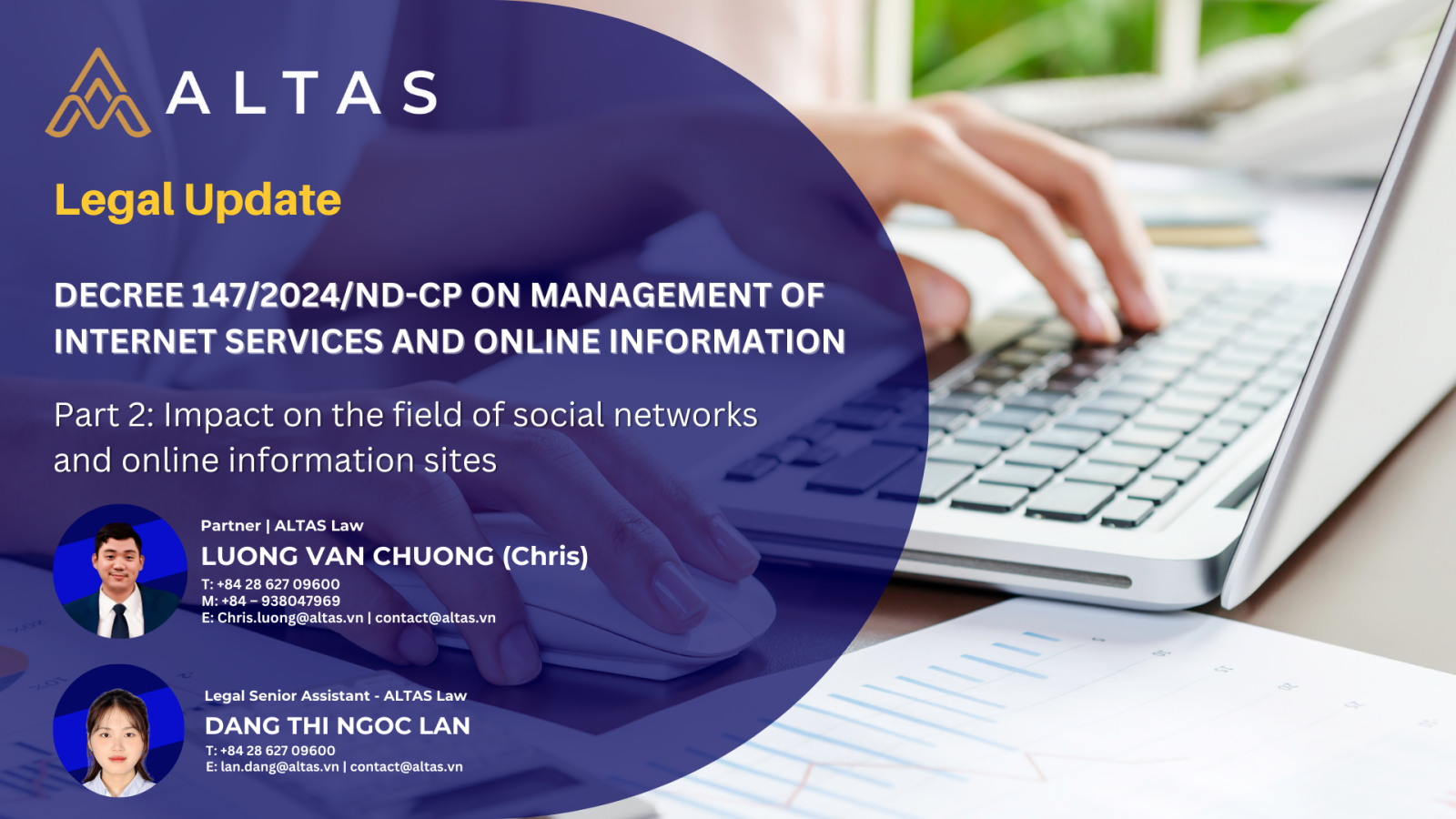 Decree 147/2024/ND-CP (Decree 147) on management, provision and use of internet services and online information in Vietnam, effective from December 25, 2024, will have an impact on domestic and foreign organizations participating in the management, provision or use of internet services and online information such as social network service providers, online application providers, application stores and online game service providers.