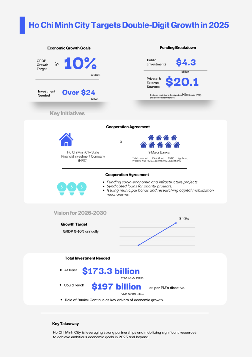 Ho Chi Minh City is targeting double-digit economic growth (≥10%) in 2025 by mobilizing its largest-ever investment, totaling over $24 billion. This funding will be allocated to socio-economic and infrastructure development projects to achieve ambitious Gross Regional Domestic Product (GRDP) growth goals.