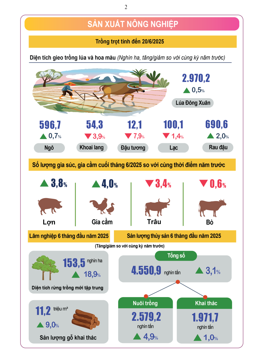Despite less favorable weather conditions, agriculture showed several positive signs. Winter-Spring rice cultivation area increased slightly, and both aquaculture and forestry output grew. However, declines in soybean and sweet potato areas, as well as cattle and buffalo herds, require close monitoring. The agricultural sector is shifting from expansion to a focus on improving quality and value-added production.