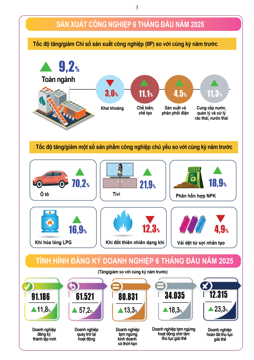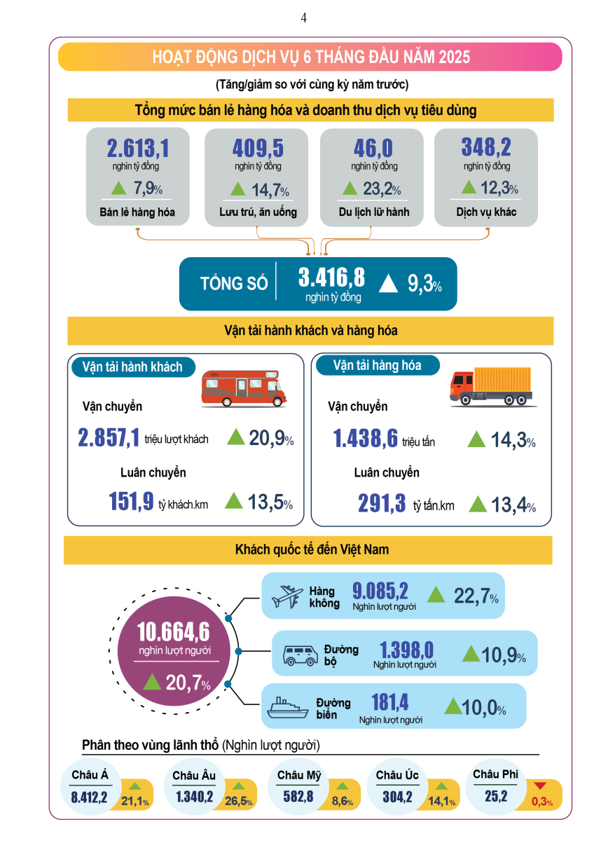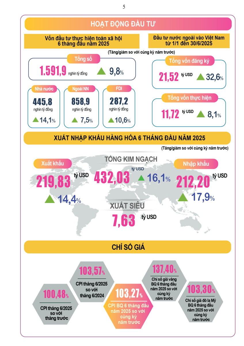 In the socio-economic landscape of Vietnam during the first half of 2025, brighter shades have gradually reemerged after a quiet period following the pandemic and global instability. The latest data from the General Statistics Office shows that the recovery momentum has not only been maintained but has also accelerated significantly in key areas such as manufacturing, tourism services, exports, and foreign investment. Through six visual infographics, the country's efforts to maintain macroeconomic stability, sustain growth, and expand new drivers of development become evident. Below are the key highlights drawn from each statistical topic: