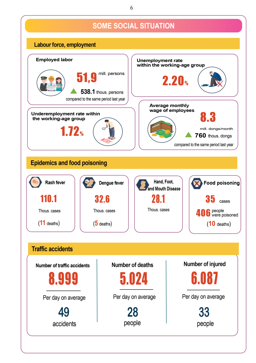 The social outlook in the first half of 2025 shows many positives, notably a clearly recovering labor market with low unemployment and underemployment rates, and significantly increased worker income. However, summer infectious diseases and food poisoning remain complex issues, requiring stronger disease prevention and food safety inspections. Traffic accidents remain a major concern, with a high average daily fatality rate. Economic recovery must be accompanied by social risk control to ensure sustainable development.