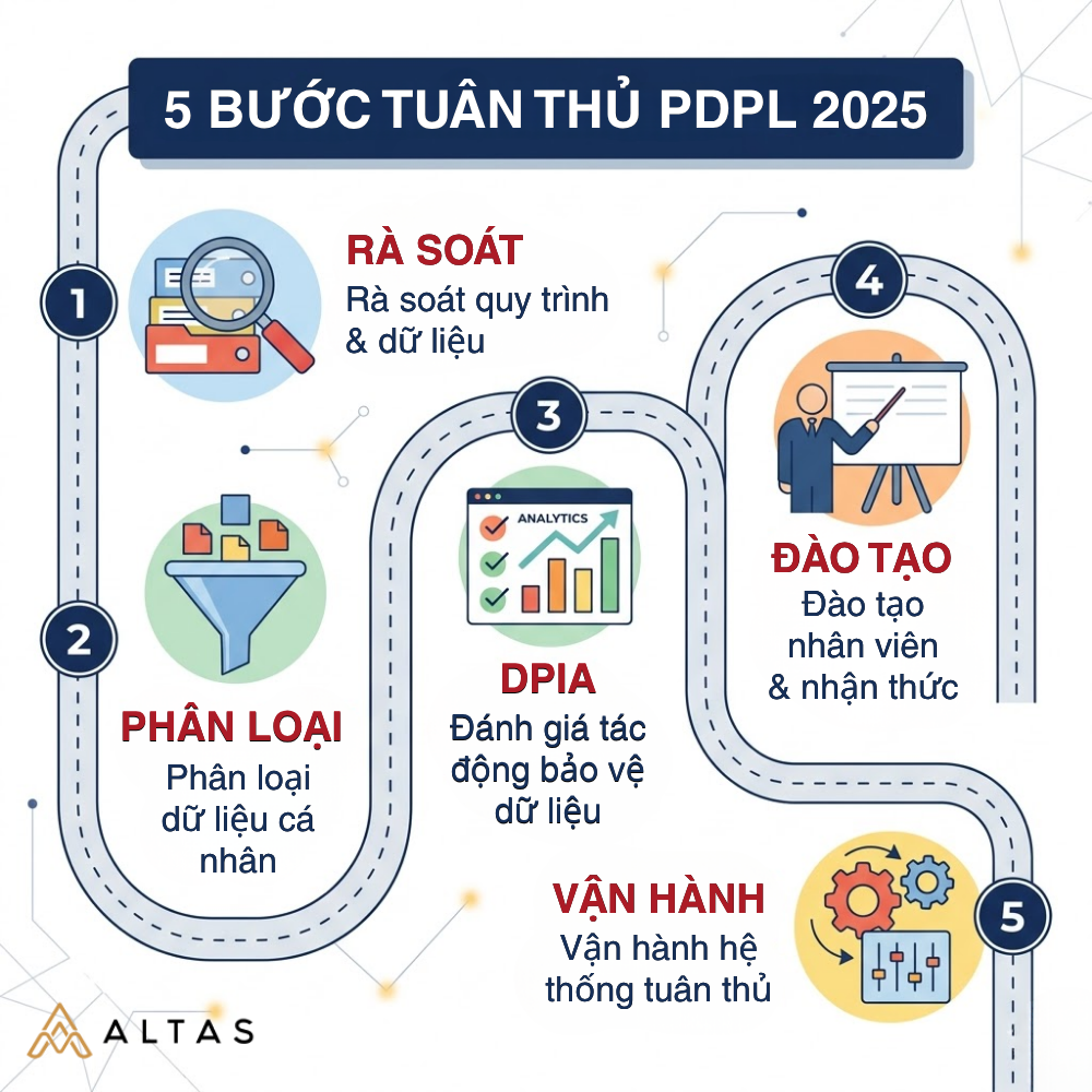 Lộ trình 5 bước tuân thủ PDPL 2025: Rà soát, Phân loại dữ liệu, Đánh giá DPIA, Đào tạo nhân sự và Vận hành.