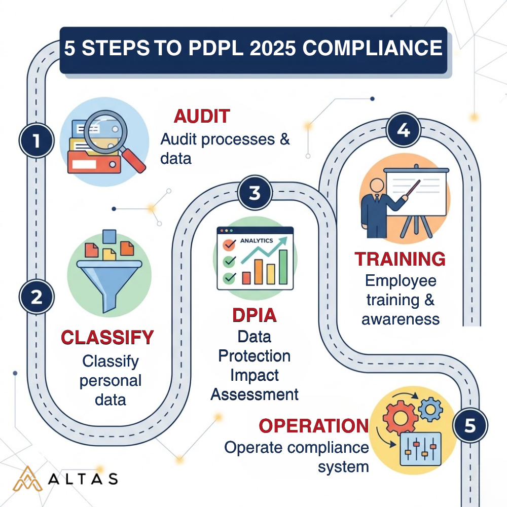 Alt Text: PDPL 2025合规5步走:审计、数据分类、DPIA评估、人员培训及运营。