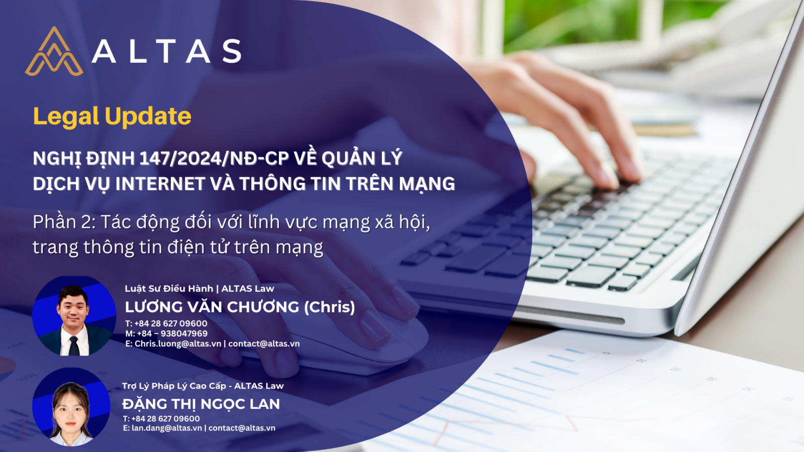Nghị định 147/2024/NĐ-CP (Nghị định 147) về quản lý, cung cấp, sử dụng dịch vụ internet và thông tin trên mạng của Việt Nam có hiệu lực thi hành từ ngày 25/12/2024, sẽ có tác động đến các tổ chức trong và ngoài nước tham gia quản lý, cung cấp hoặc sử dụng các dịch vụ internet và thông tin trực tuyến như nhà cung cấp dịch vụ mạng xã hội, nhà cung cấp ứng dụng trực tuyến, cửa hàng ứng dụng và nhà cung cấp dịch vụ trò chơi trực tuyến.