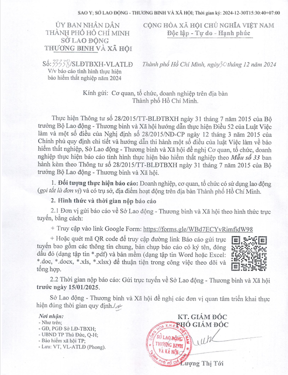Official Letter No. 33338/SLĐTBXH-VLATLĐ dated December 30, 2024, on the 2024 report on the implementation of unemployment insurance.