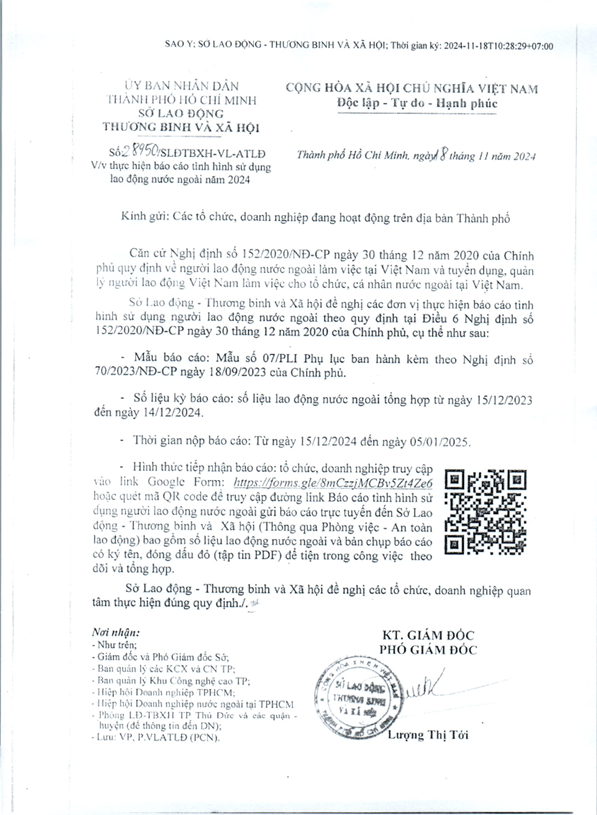 Công văn 28950/SLĐTBXH-VL-ATLĐ ngày 18/11/2024 về việc thực hiện báo cáo tình hình sử dụng lao động nước ngoài năm 2024;
